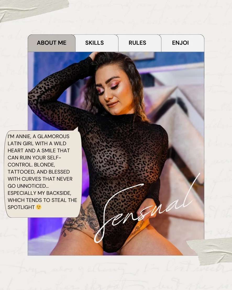 I’m Annie, a glamorous Latin girl with a wild heart and a smile that can ruin your self-control. Blonde, tattooed, and blessed with curves that never go unnoticed… especially my backside, which tends to steal the spotlight 😉.